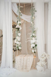 Access to full studio, features our new Charlotte wall, new placement of chimney mantel with our new pink French Settee, Florals all throughout the barn which can easily be moved, our floral swing, Green arch with painted canvas flooring, All new white floors, and our new accent wall. Please pick up furniture and do not drag. Gowns available to rent.